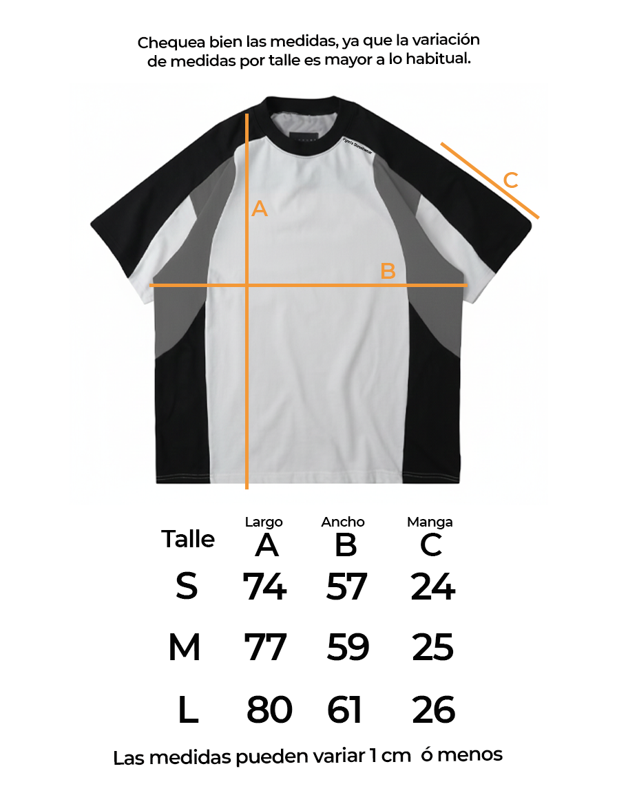 Remera corte oversize confeccionada en algodón pesado, una tela mas pesada que la habitual. La remera cuenta con tres tipos de telas diferentes, son todas 100% algodón, pero varia entre jersey 12.1 en el color blanco / Jersey 16.1 en el color negro / Tela Reeb en los apliques de color gris dandole textura al color. Cada remera pesa aproximadamente 285 gramos dependiendo el talle que elijas.